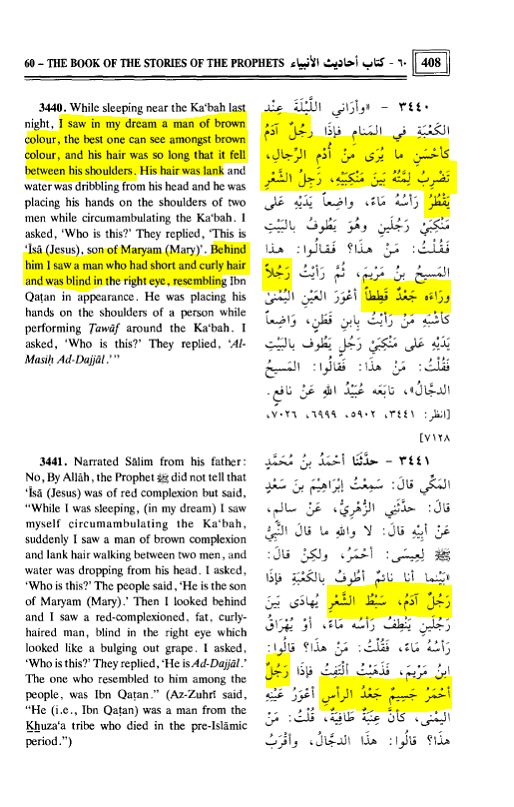 Now there are 2 subsequent Hadiths which describe Jesus according to the Prophet's vision of him circling the Ka'ba. It is self-evidently a very different description to the one from the Mi'raj. In that Hadith it is emphasized that Jesus is dark or brown complexion "the best one can see amongst brown color". And his hair is described as lank and long reaching down to his shoulders. Then in the same Hadith Dajjal is described as having curly hair جعد. Virtually every Sharih is agreed that جعد when applied to Dajjal means he has curly hair.